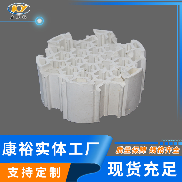 輕瓷填料產(chǎn)品的堆積重量為280~350kg/m3,遠(yuǎn)小于一般普通規(guī)整填料的堆積密度。產(chǎn)品的堆積空隙率≥72%,顯氣孔率≥15%,總空隙率高達(dá)85%以上。從面具有填料塔重量輕、載荷小、操作阻力小、壓降低的優(yōu)點(diǎn)。