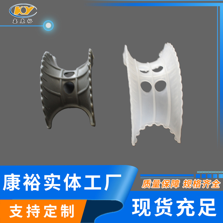 塑料異鞍環(huán)是20世紀(jì)70年代美國Noton公司對普通矩鞍環(huán)填料作出了改進(jìn),其特點(diǎn)是將扇形弧面改進(jìn)成帶鋸齒邊緣的貝殼狀弧面,并在鞍背上增加了開孔,這樣填料層內(nèi)的通道更加通暢,改善了液體分布性能,降低了氣體通過的阻力,提高了傳質(zhì)性能。塑料異鞍環(huán)鞍形填料類似于馬鞍形狀,這種填料層中主要為弧形的液體通道,填料層內(nèi)的空隙較環(huán)形填料(尤其較拉西環(huán)填料)更加連續(xù)。