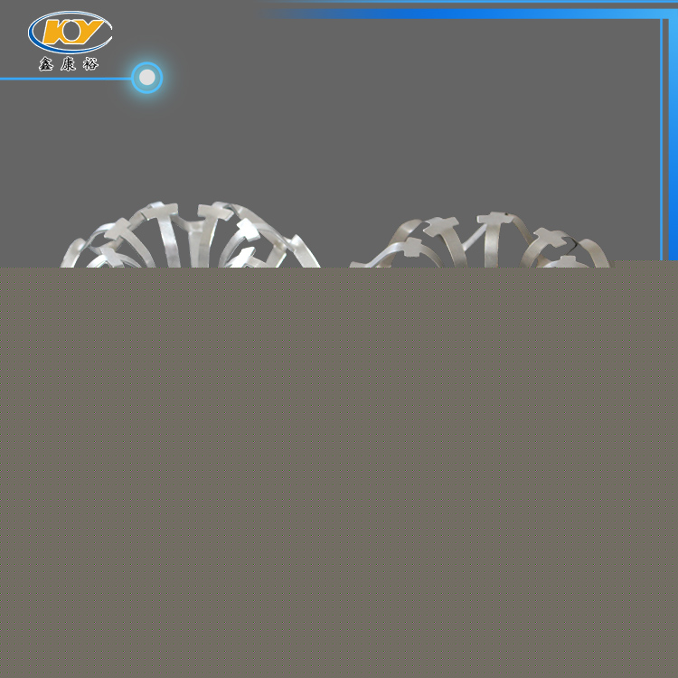 鋁花環(huán)填料主要材質(zhì)為鋁合金,產(chǎn)品采用鋁合金板沖壓制成,外觀為橢球狀填料,包括有由一塊板材一體成型內(nèi)環(huán)和外環(huán),該內(nèi)環(huán)與外環(huán)之間連接有筋,所有筋是由上半圓環(huán)筋和下半圓環(huán)筋構(gòu)成,每?jī)上噜徑钣缮习雸A環(huán)筋和下半圓環(huán)筋交錯(cuò)排列。這樣具有比表面積大,單位重量輕。產(chǎn)品除具有一般的通量大、不易被堵塞、通量大、阻力小、壓降低等優(yōu)點(diǎn)外,還由于填料的空隙處能有較高的持液量,可使塔內(nèi)液體的停留時(shí)間較長(zhǎng),從而增加了氣液兩相的接觸時(shí)間,提高了填料的傳質(zhì)效率。
